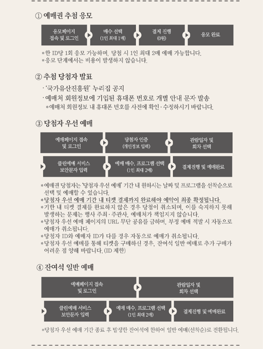 당첨자는 5월 15일 발표되며, 이후 당첨자 우선 예매(5.16~5.19) 및 잔여석 일반 예매(5.21~행사당일)로 나뉘어 진행됩니다.