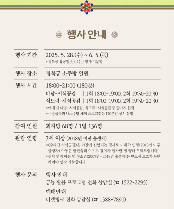 경복궁 소주방 일원에서 열리는 이 프로그램은 총 180분간 다채로운 체험이 진행되며, 단순한 관람을 넘어 참여와 공감이 중심이 됩니다.