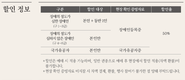 장애인, 국가유공자 등 대상자는 증빙자료 제출 시 50% 할인을 받을 수 있으며, 예매 시점에만 할인이 적용됩니다.