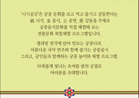 ‘시각·음식·공연·감동’을 주제로 궁중 문화의 진수를 직접 맛보고 느낄 수 있는 복합 체험 행사입니다.