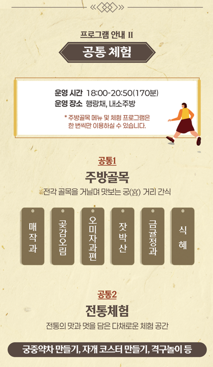 A. 궁중음식 체험(식도락), 궁중다과 체험(다담), 전통놀이 및 거리간식 체험 등 총 6가지 프로그램이 준비되어 있습니다.