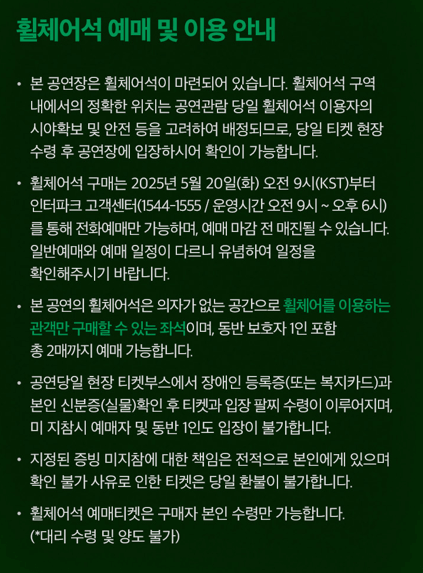 ♿ 휠체어석은 전화 예매만 가능하며, 당일 본인 확인 후 입장합니다.