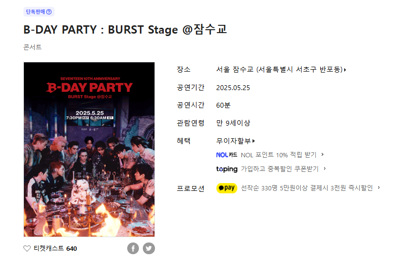 단 하루, 단 한 장소에서! 인터파크 단독판매로만 2025년 5월 19일 오후 5시부터 예매 가능한 BURST Stage가 드디어 열린다! 세븐틴 콘서트의 감동을 잠수교 콘서트로 이어간다! 게다가 무료공연이라니? 이건 놓치면 평생 후회!