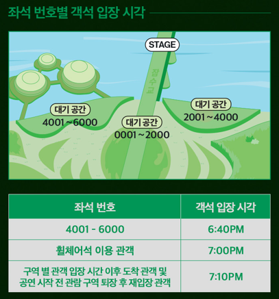 좌석은 무작위 배정된 팔찌로 현장에서 지정되며, 공연 당일 현장 판매는 없습니다. 반드시 사전 인터넷 예매를 완료하세요.