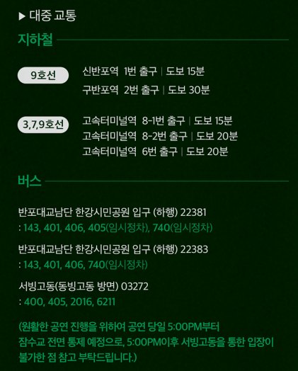 📍지도 앱에 ‘잠수교 콘서트’ 또는 ‘반포한강공원’ 검색 시 도보 경로 확인 가능