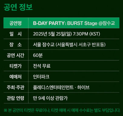 'B-DAY PARTY : BURST Stage'는 서울 잠수교라는 이색적인 공간에서 열리는 콘서트입니다.
